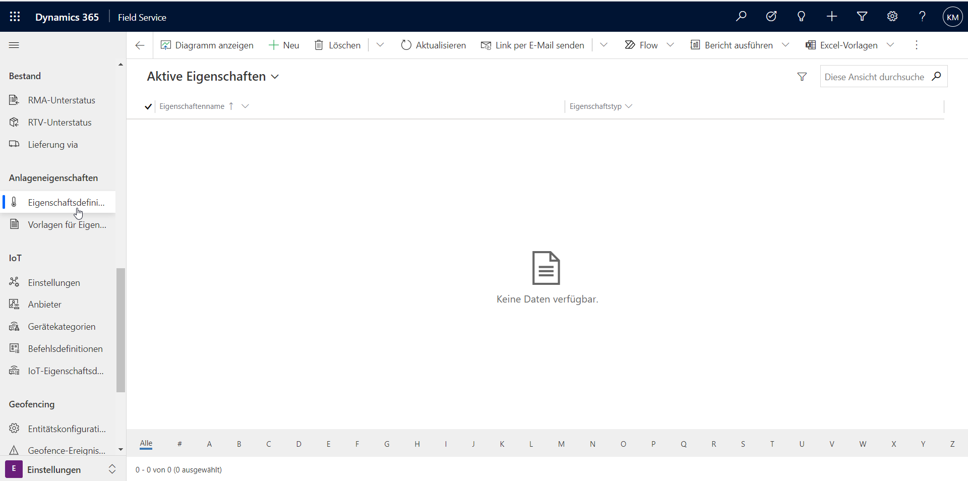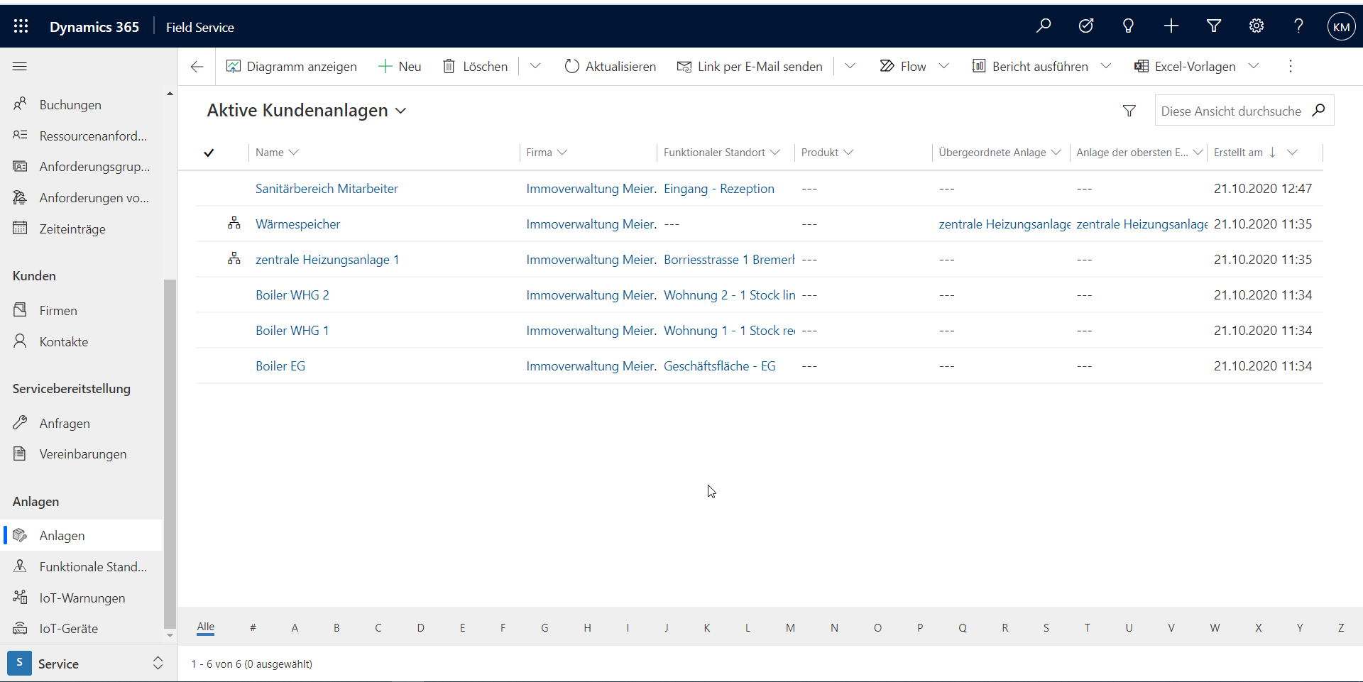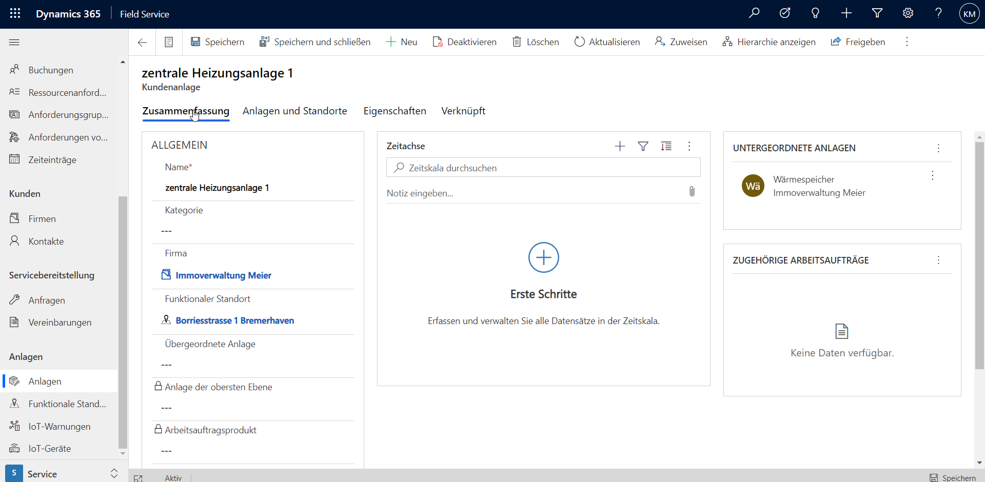 Beim Einstieg in den Service-Bereich der Field Service APP im Dynamics offenbart ein Blick auf das Menü in der linken Spalte, dass Anlagen einen zentralen Bereich bilden.