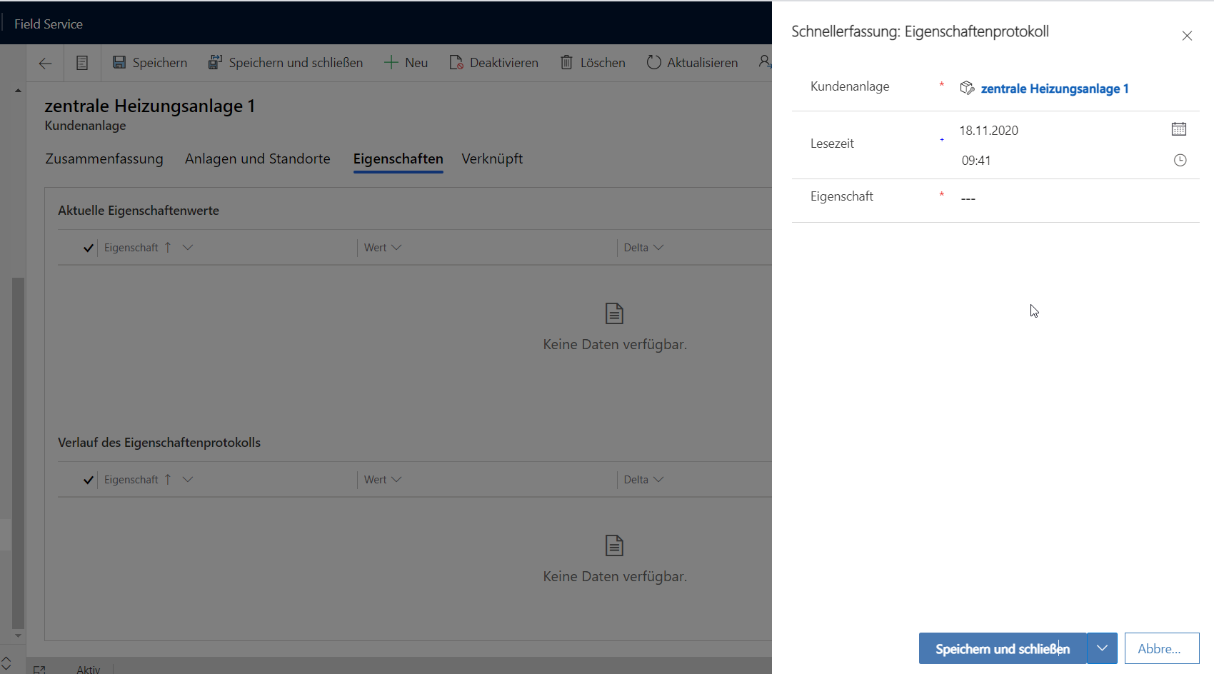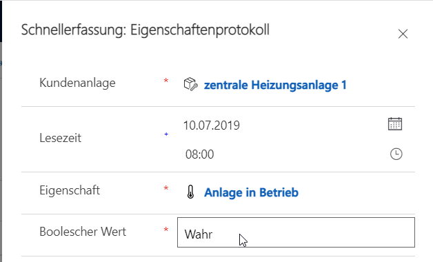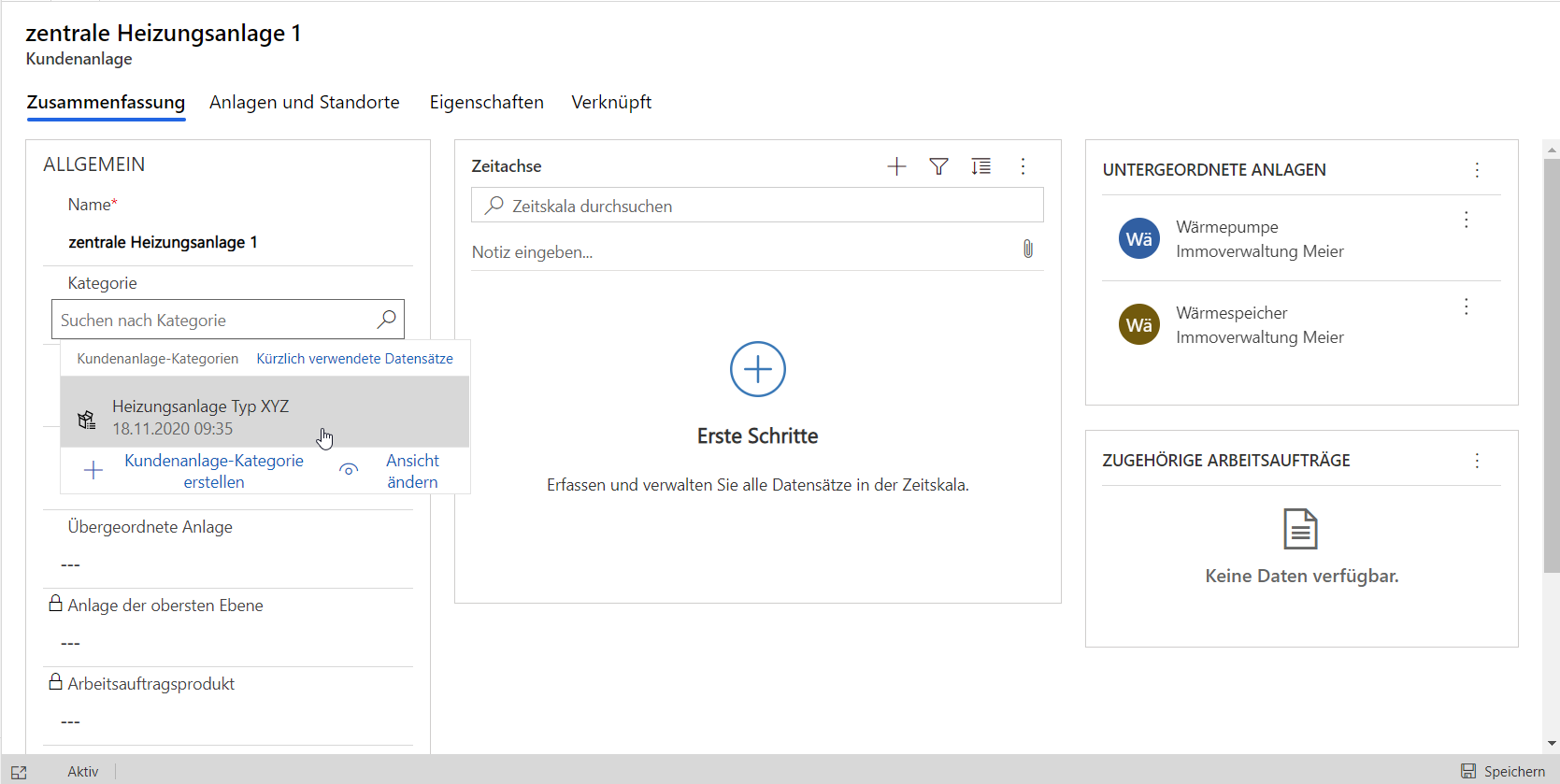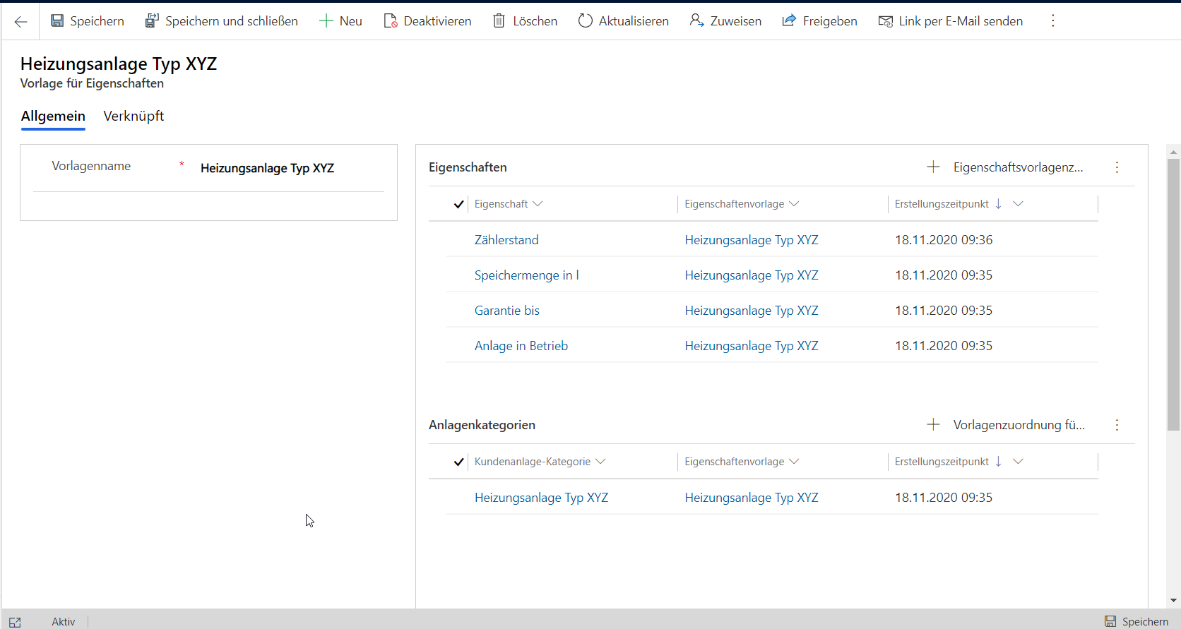 An der Anlage können jetzt die über die Vorlage definierten Eigenschaften erfasst werden.