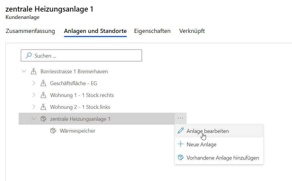 Im Reiter „Anlagen und Standorte“ können Sie zum einen den aktuellen Standort der Anlage (oberste Ebene der Baumstruktur) sehen, zum anderen auch die Struktur der Anlage selbst.