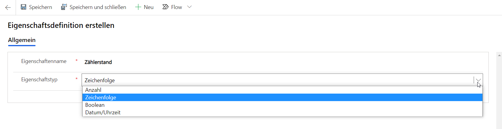 Dies geht ganz einfach: Geben Sie unter „Eigenschaftsname“ eine passende Bezeichnung ein und weisen ihr einen Eigenschaftstyp zu.